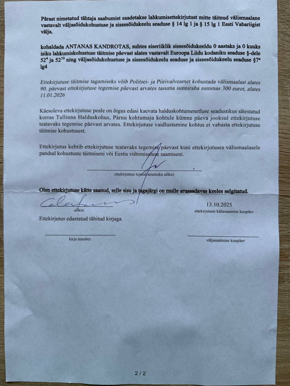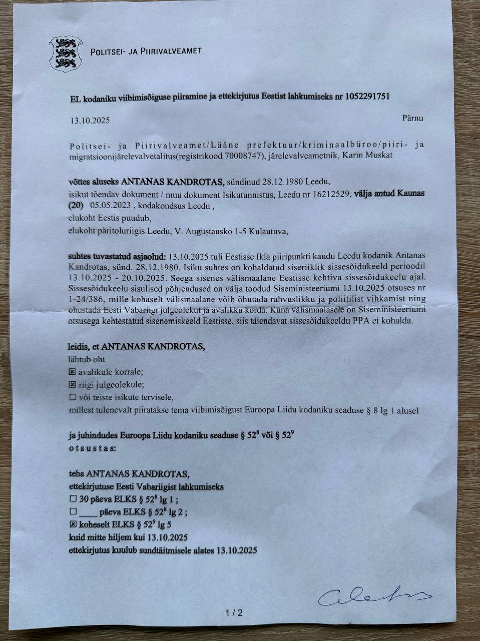 Taip pat perklausė ar vyras negavo informacijos apie draudimą būti Estijoje, tikslinosi, kodėl jis tapo persona non grata. Įdomu tai, kad ir policijos sistemoje draudimo priežastis nebuvo įvardinta, tačiau buvo nurodyta, kad A.Kandrotas Estijoje negali lankytis iki spalio 20 d., iki savivaldos rinkimų pabaigos, o pažeidus šį draudimą jam grėstų iki 5 metų kalėjimo.