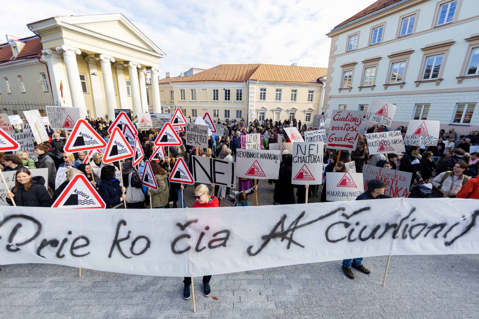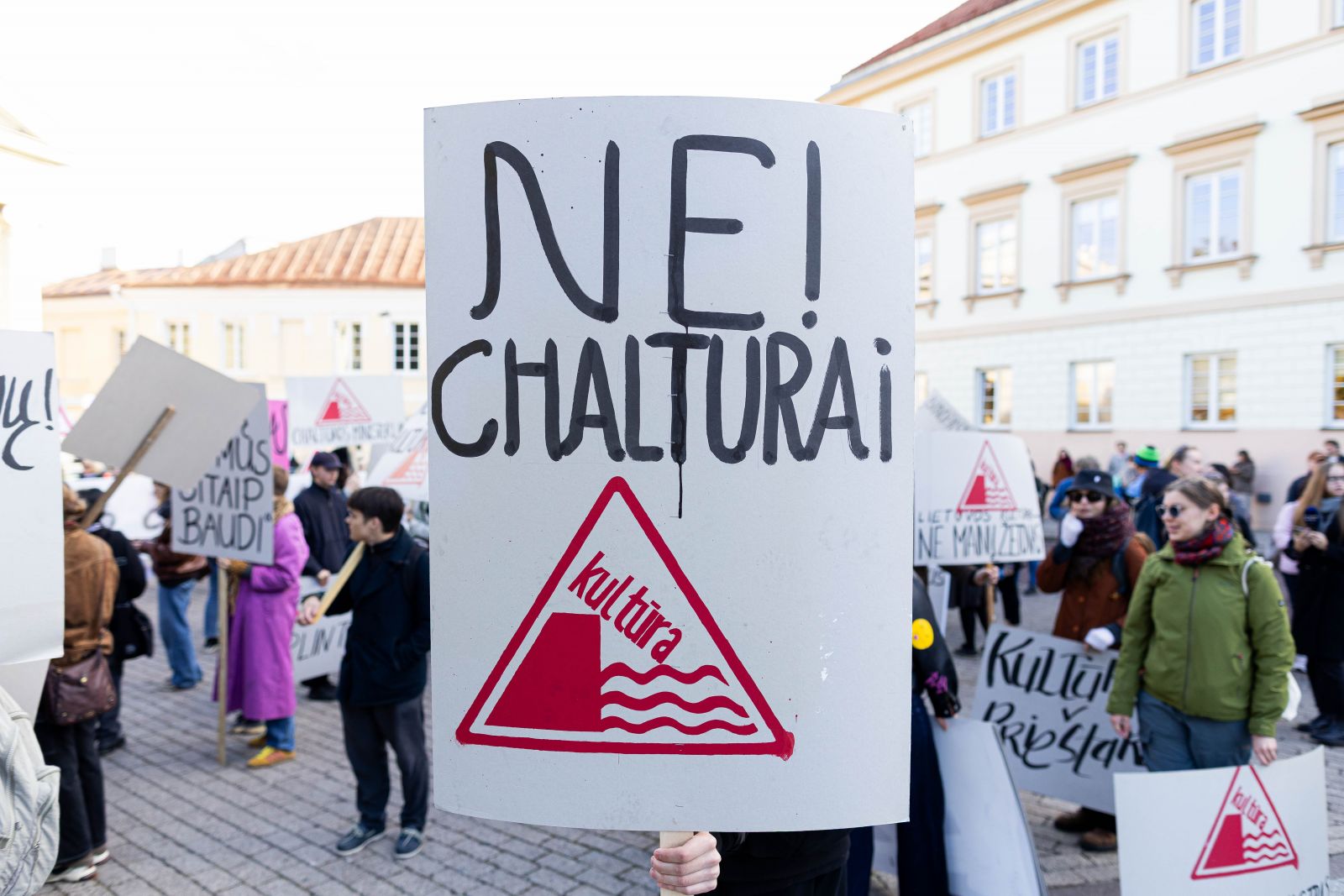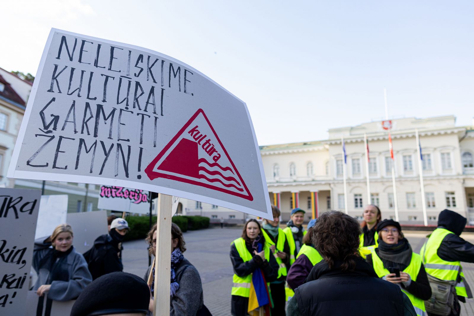 Simono Daukanto aikštėje susirinkusieji būriavosi nešini įvairiais plakatais su užrašais: „Kultūra ≠ chaltūra“, „Prieš makaroninį metą“, „Chaltūros ministerija“, „Nemuno dešra – kultūros faršas“, „Supratingumo durnumui?“, „Kultūra prie bedugnės krašto“ ir pan. Prie Prezidentūros susirinkę aktyvistai šaukė „gėda Nausėda“, „gėda Nausėda – kaip tau ne gėda?“, „gana yra gana“.