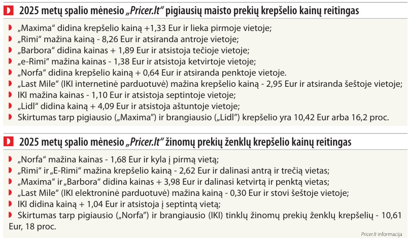 2025 metų spalio „Pricer.lt" fiksuojamo vidutinio pigiausių maisto produktų krepšelio kainų analizė rodo, kad pigiausių maisto produktų vidutinis krepšelis Lietuvos parduotuvėse palyginus su 2025 rugsėjo mėnesiu pigo - 0,72 Eur (-1 proc.) ir buvo 3,73 Eur (+5,6 proc.) brangesnis, nei praėjusių metų spalio mėnesį. Jeigu palygintume su prieškariniu 2021 metų spalio mėnesiu, krepšelis yra 15,84 Eur (+28,7 proc.) brangesnis.