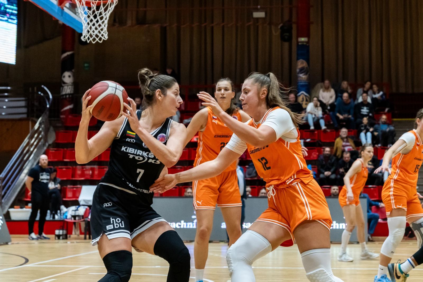 Be traumuotos Justinos Miknaitės ir komandą palikusios Lauros Želnytės į Chomutovą atvykusi „Kibirkštis" sėkmingai pradėjo rungtynes. Keturis tolimus metimus per ketvirtį pataikiusios Kamilės Nacickaitės-Van Der Horst vedamos viešnios kėlinio viduryje įgijo dviženklį pranašumą - 18:8. Po Chomutovo komandos vyr. trenerio paprašytos pertaukėlės situacija pamažu ėmė keistis, o vilniečių turėtas 12 taškų pranašumas paskutinę kėlinuko minutę sumažėjo daugiau nei perpus - 21:16.